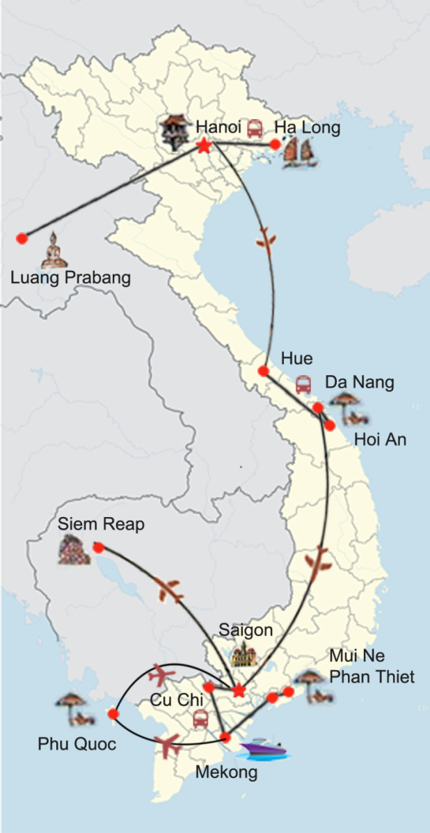 Kombinieren Sie Laos, Vietnam und Kambodscha auf einer großen Indochinareise: Sie starten Ihre Entdeckungstour in der Altstadt der UNESCO-Weltkulturerbestätte Luang Prabang in Laos. Anschließend lernen Sie Vietnam in all seinen Facetten kennen. Erkunden Sie die französischen Kolonialbauten Hanois bei einem Spaziergang um den Hoan Kiem-See, beobachten Sie den spektakulären Sonnenuntergang auf Ihrer Kreuzfahrt in der Halongbucht, stöbern Sie durch die charmante Altstadt von Hoi An mit seinen bunten Lampions und erleben Sie das pulsierende Nachtleben Saigons. Bevor als krönender Abschluss Ihrer Rundreise die überwältigenden Tempelanlagen von Angkor auf Sie warten, entspannen Sie zwischendurch einige Tage am Meer auf der tropischen Insel Phu Quoc.