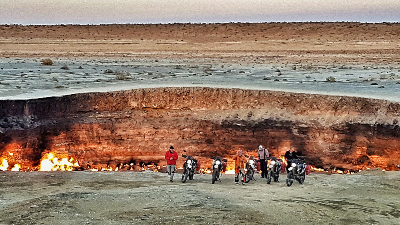 Turkmenistan 3 Tage – 710 km Weiter nach Osten, bringt uns das Motorrad zum unbekannten und verschlossenen Land Turkmenistan. Das Land ist von der Karakum Wüste durchzogen. Wir besuchen die Hauptstadt Ashgabat mit der goldglänzenden, bizarren Architektur, übernachten in der Wüste am Gaskrater und werden ein unbeschreibliches Nachtlichterspiel erleben mit einem Ausblick auf Milliarden von Sternen. Städte: Ashgabat – Derweze