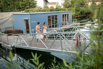 Es ist schon etwas ungewöhnlich, wenn Enten beim Saunaaufguss zuschauen können. In der Hausbootsauna der Therme Bad Aibling gehört das zum besonderen Ambiente. Seit Herbst 2017 liegt das Saunaboot „Kiebitz“ im Bad Aiblinger Triftbach. Die Hausbootsauna mit einem Mühlenrad für den Saunaaufguss ist ein echtes Highlight. Hier ist es besonders leise und entspannend, der